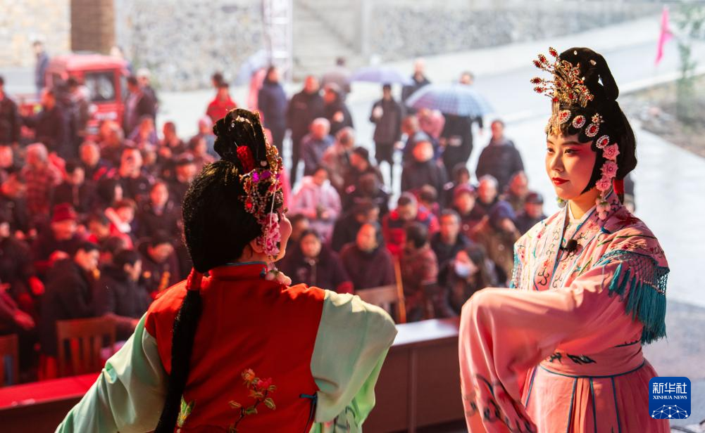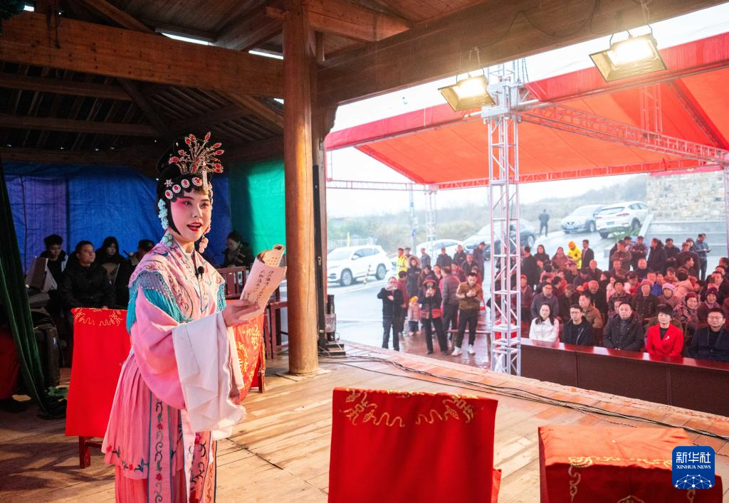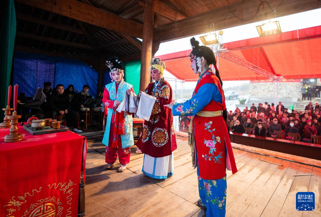 1月15日,演员在伊塘镇长木塘村表演祁剧《孟丽君》。