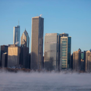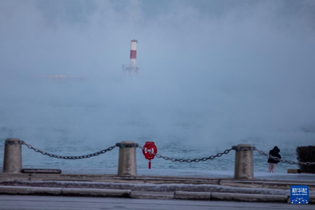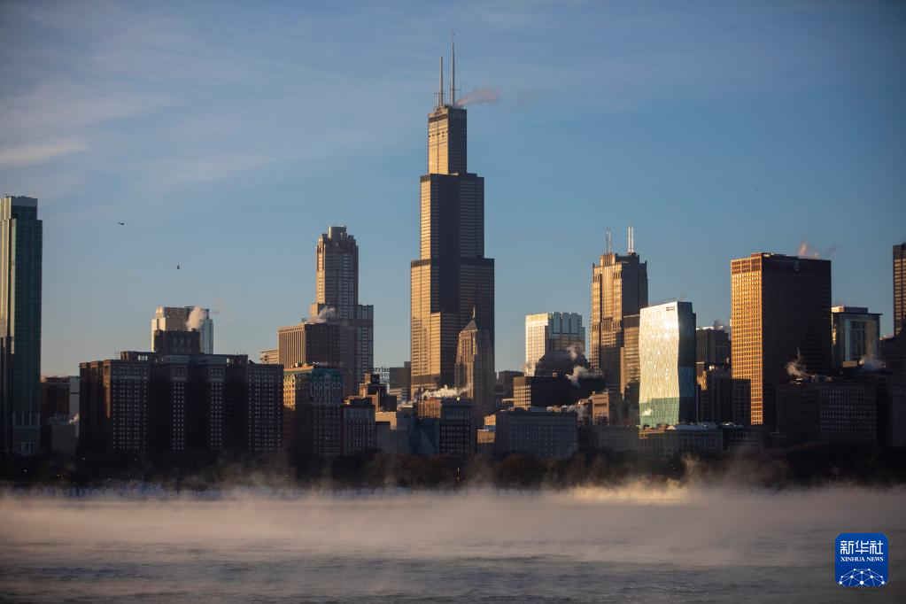 这是1月14日在美国芝加哥拍摄的严寒中的城市景观。