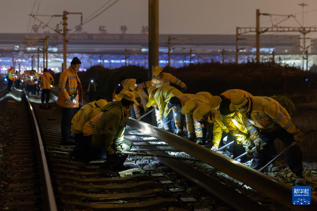 当日凌晨,中国铁路上海局集团有限公司上海工务段工人对上海虹桥站站区共计500米长的铁路钢轨进行换轨施工,从切割旧轨、安装新轨到新轨焊接打磨,各道工序有条不紊,为即将到来的春运行车提供安全保障。