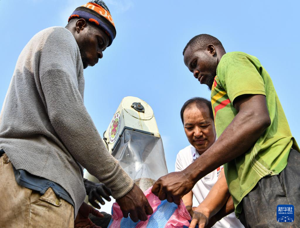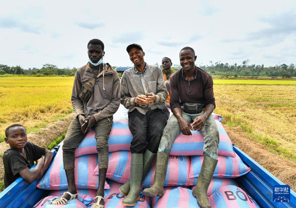 1月8日,在科特迪瓦南部迪沃省格格杜垦区,中国援科农业技术合作组组长郭长友(右二)和当地稻农将谷粒装袋。