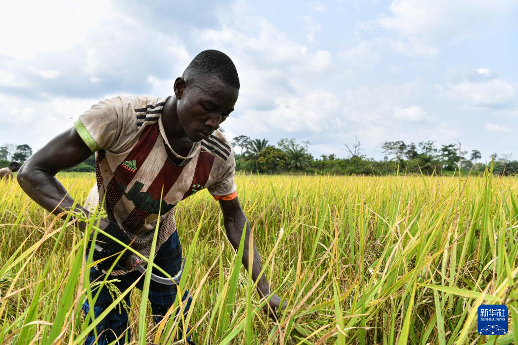 1月8日,稻农在科特迪瓦南部迪沃省格格杜垦区收割水稻。