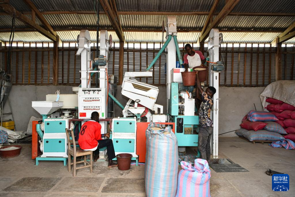 1月8日,在科特迪瓦南部迪沃省,稻农在大米加工坊内碾米。