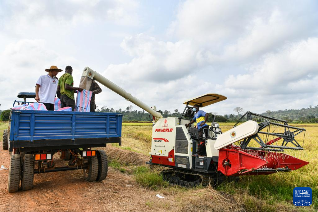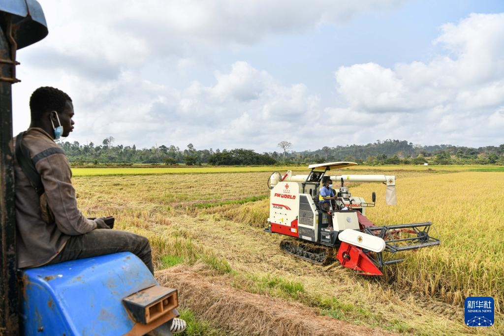 1月8日,在科特迪瓦南部迪沃省格格杜垦区,中国援科农业技术合作组组长郭长友(右一)指导稻农驾驶收割机收割水稻(无人机照片)。
