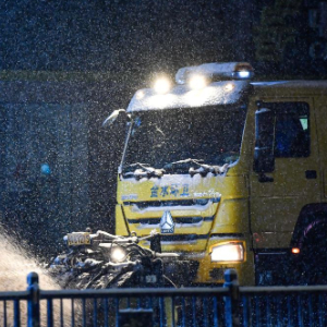 1月15日晚,一辆扫雪车在郑州市花园路进行扫雪作业。