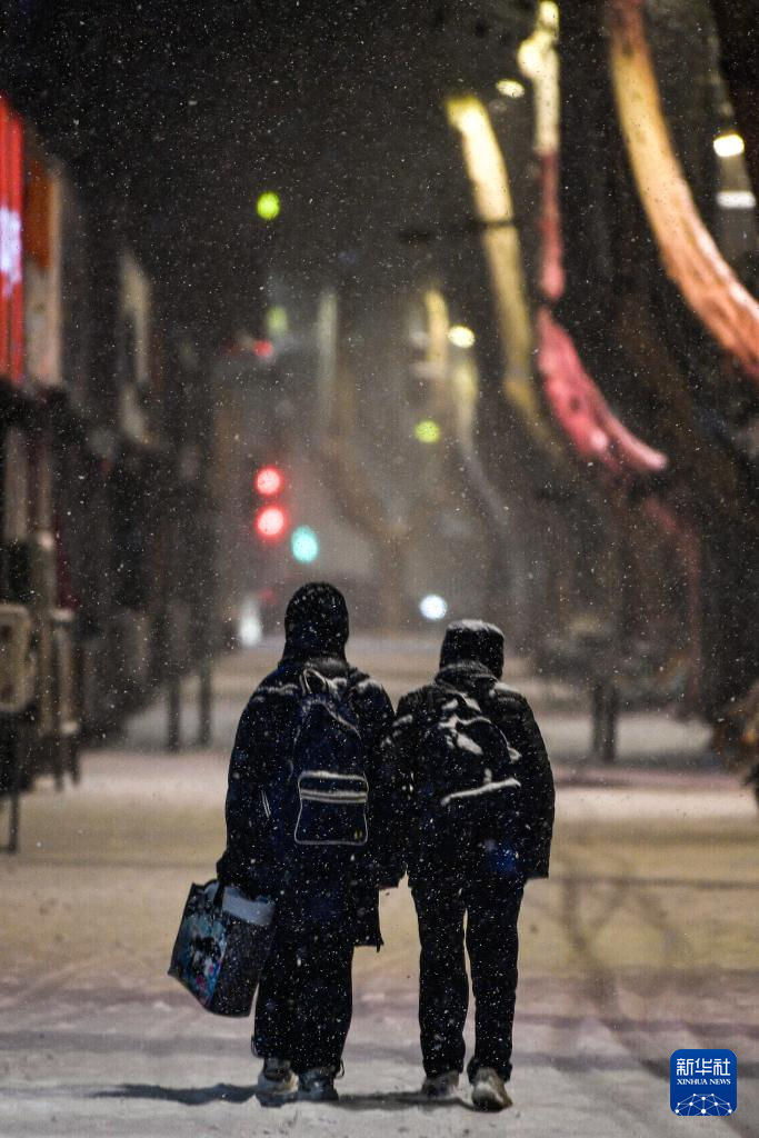 1月15日晚,两名市民在郑州街头冒雪前行。
