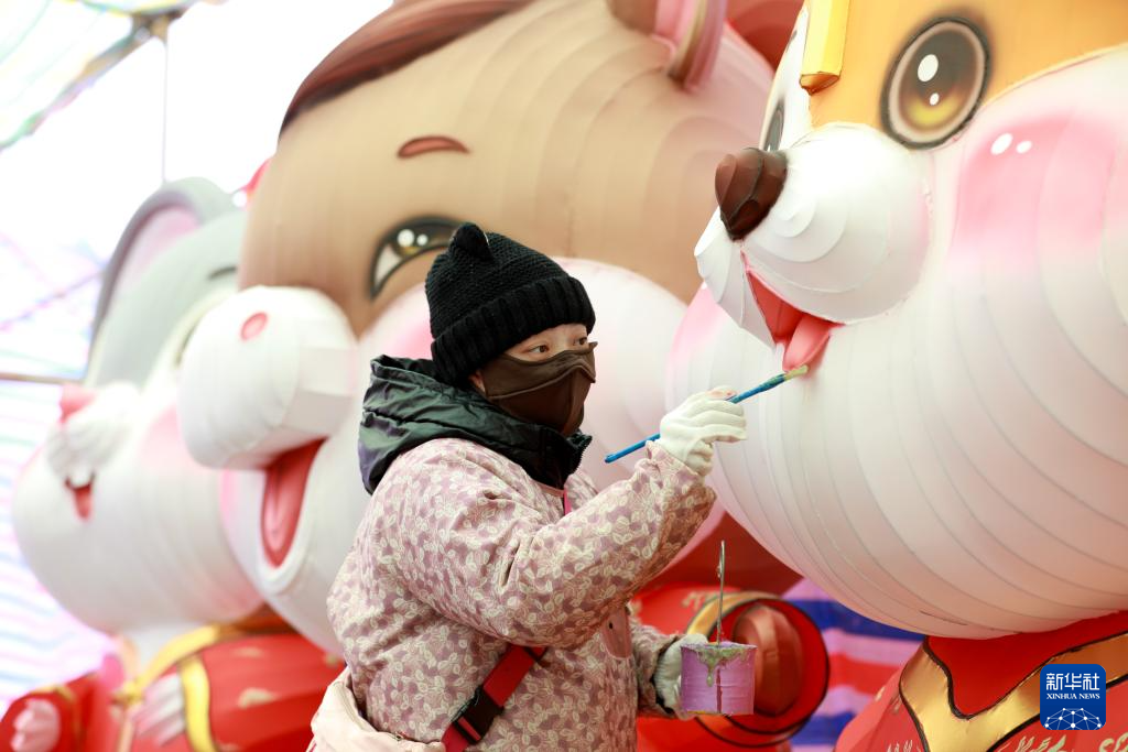 1月16日,民间艺人在山东省枣庄市人民公园安装花灯。