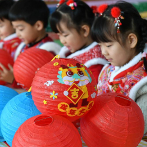 1月16日,山东省烟台市福山区清洋街道中心幼儿园的小朋友在制作灯笼。