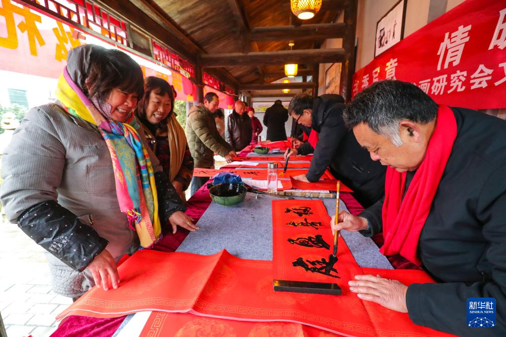 1月16日,书法爱好者在河南省信阳市光山县司马光小镇为群众书写春联。