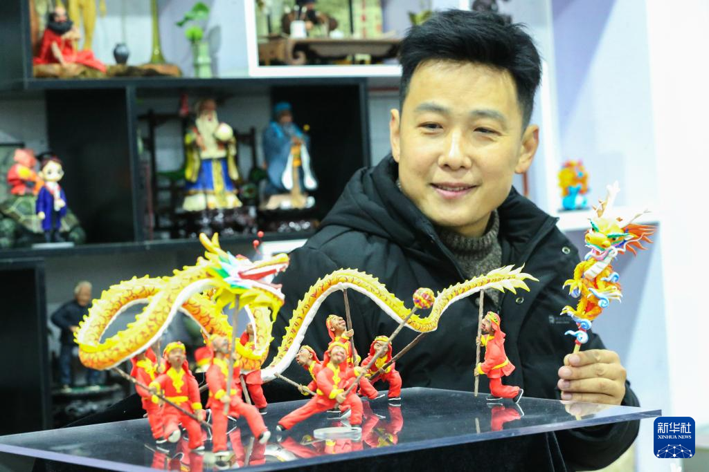 1月16日,河南省驻马店市非物质文化遗产捏面人技艺的传承人张新芳在创作作品《龙腾虎跃迎新春》。