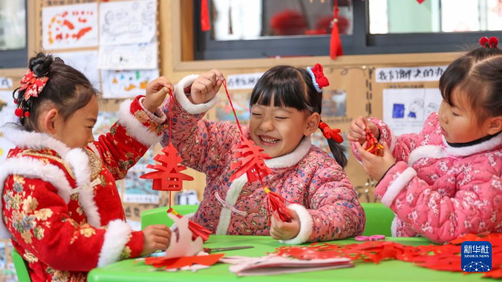 1月16日,贵州省铜仁市玉屏侗族自治县实验幼儿园的小朋友在制作新春主题剪纸作品。