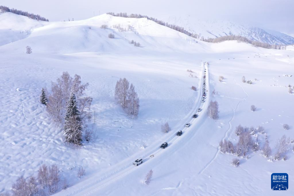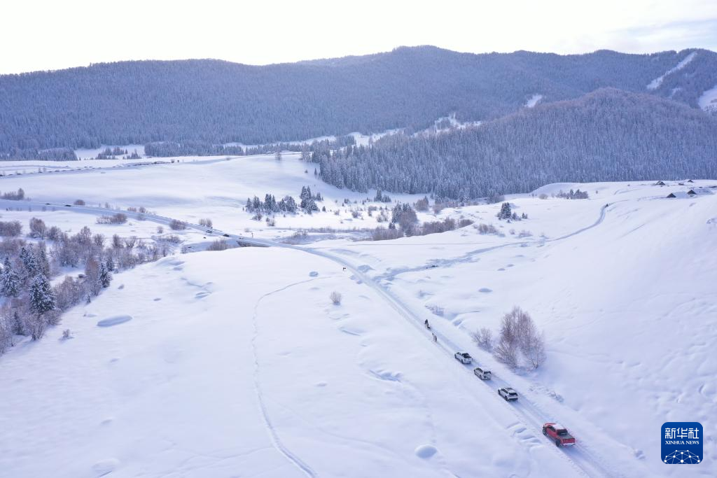 这是1月16日拍摄的禾木村排队向外通行的车辆(无人机照片)。