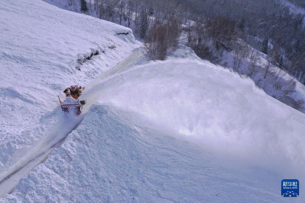 这是1月16日拍摄的疏通布尔津县县城通往禾木村雪阻道路的现场(无人机照片)。