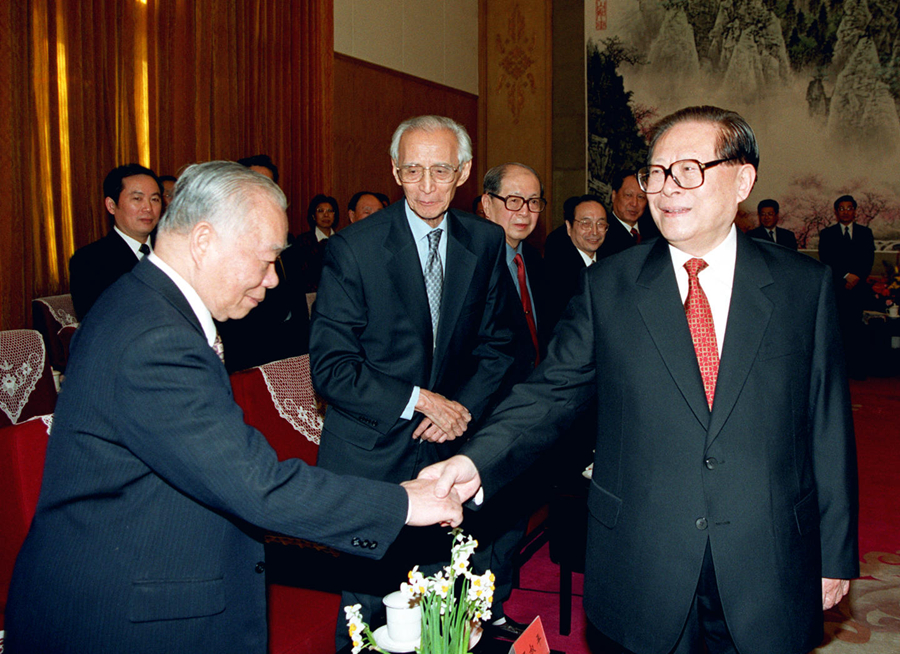 2002年2月8日,中共中央举行党外人士迎春座谈会。这是江泽民同志和张克辉同志握手。