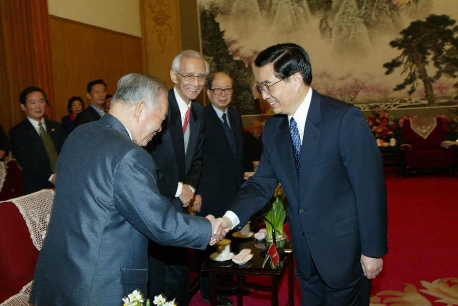 2003年1月26日,中共中央举行党外人士迎春座谈会。这是胡锦涛同志和张克辉同志握手。