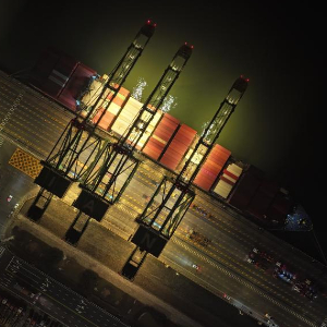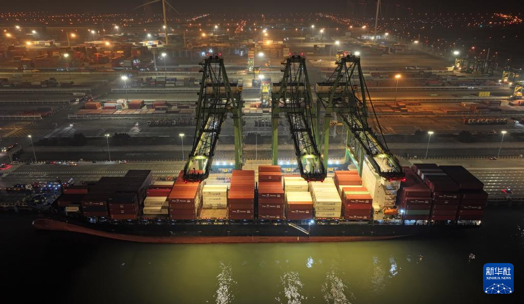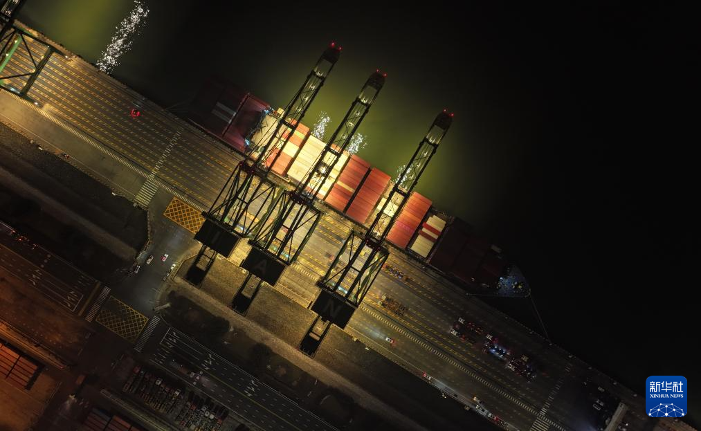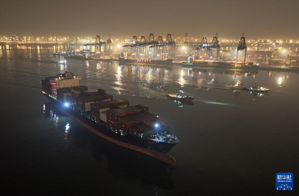 1月16日,大型集装箱班轮“巴赫”号靠泊在天津港太平洋国际集装箱码头(无人机照片)。