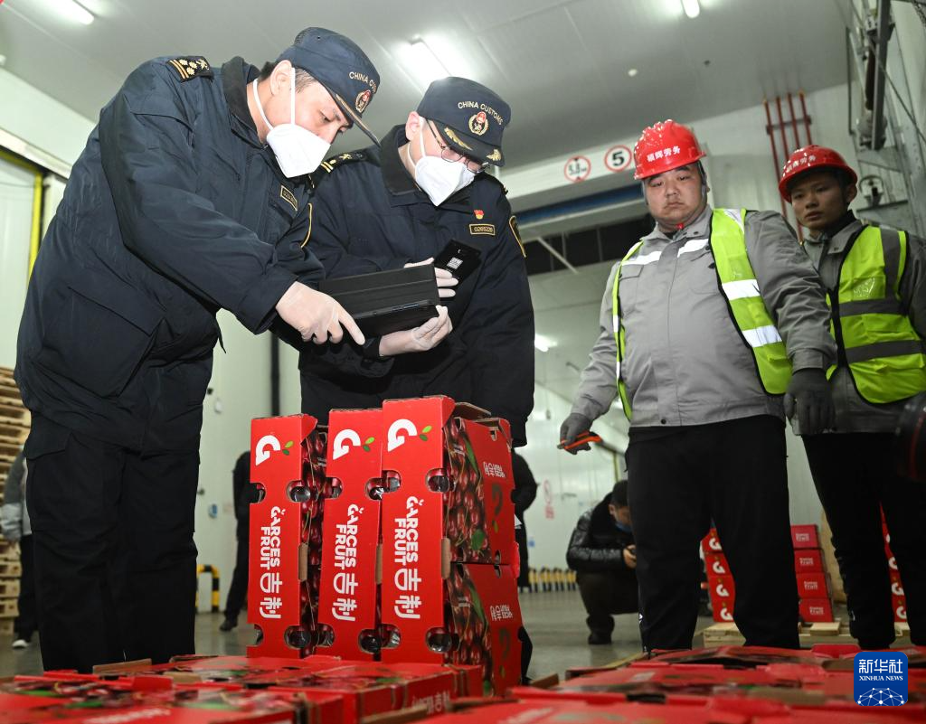 1月17日,在天津东疆保税港区,东疆海关工作人员正在查验进口车厘子。