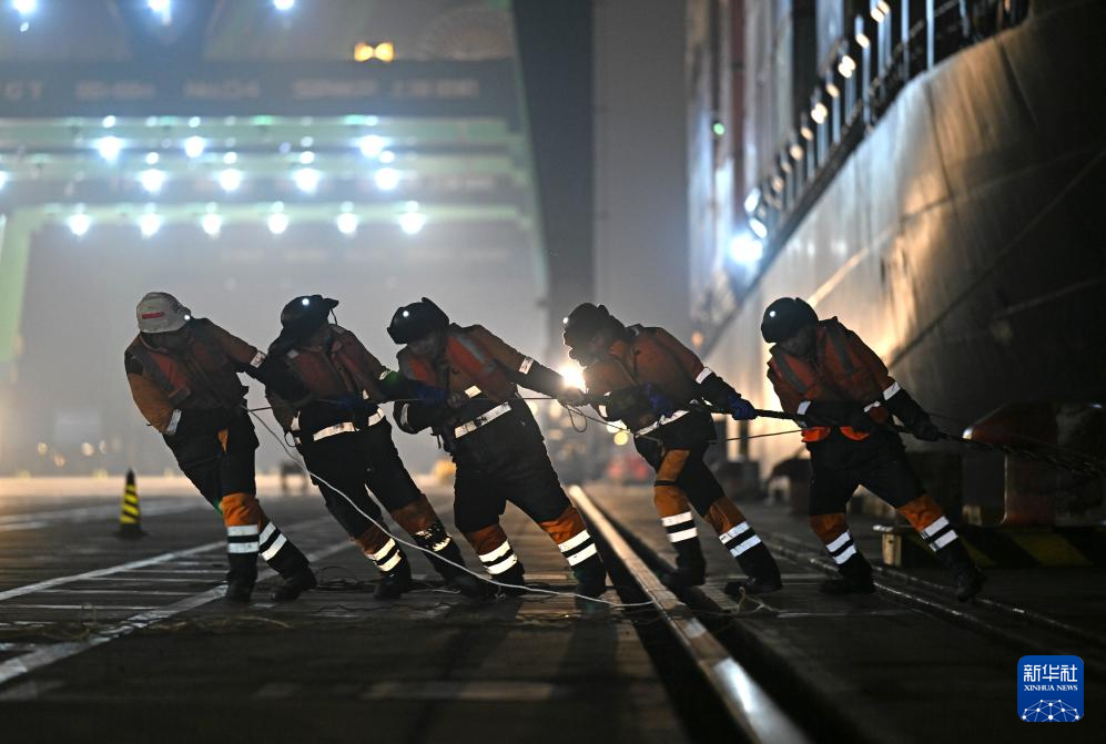 1月16日,工作人员在为刚靠泊码头的“巴赫”号集装箱班轮固定缆绳。