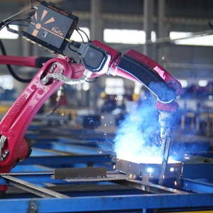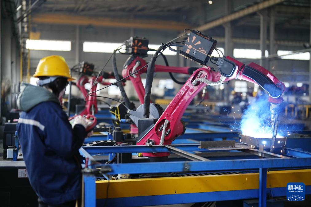 1月16日,在位于乐亭县的华北康港钢构有限公司,工人在调试焊接机器人手臂。