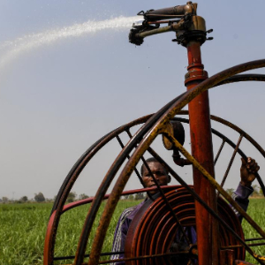 1月14日,在多哥阿尼耶,工人在甘蔗田里进行喷灌作业。