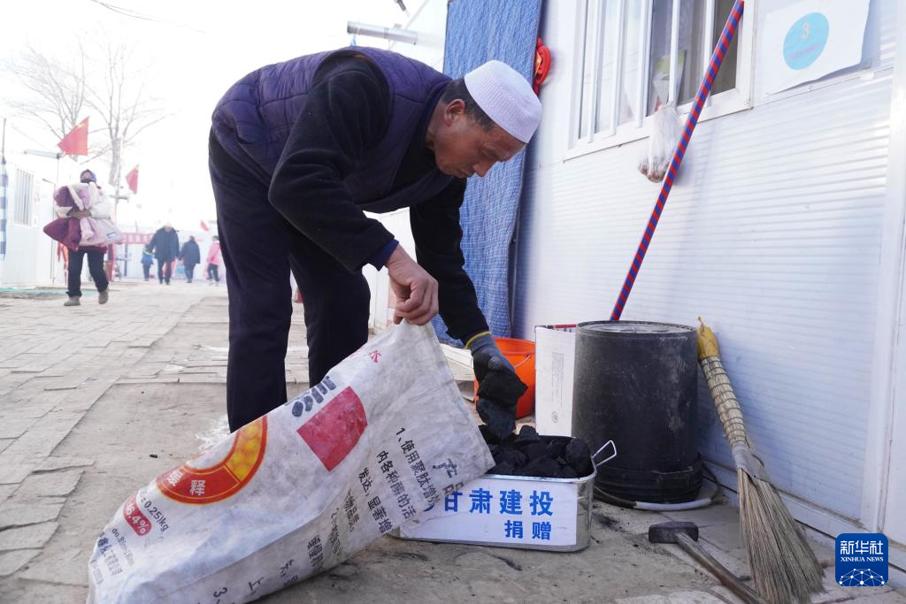 1月16日,在甘肃省临夏州积石山县刘集乡阳洼村安置点的板房门口,群众捡拾煤炭准备烧火炉。