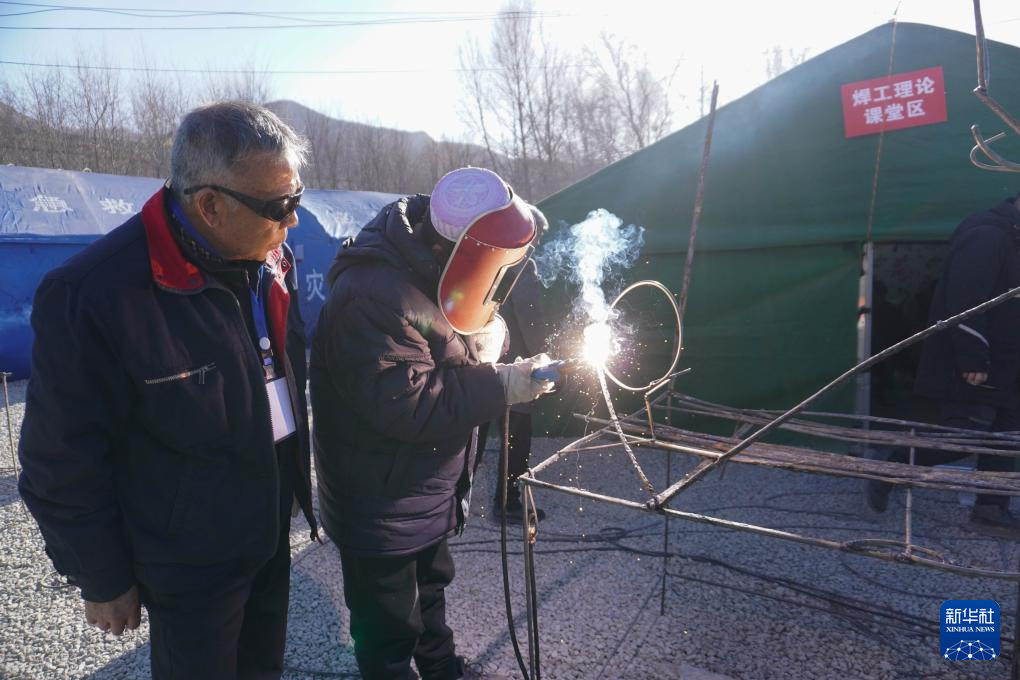 1月16日,在甘肃省临夏州积石山县大河家镇陈家村安置点,群众参加电焊技能培训班。