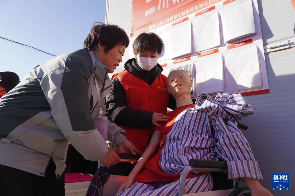 1月16日,在甘肃省临夏州积石山县大河家镇陈家村安置点,群众参加护理技能培训班。