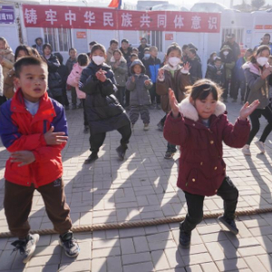 1月16日,在甘肃省临夏州积石山县刘集乡阳洼村安置点,小朋友在趣味运动会上进行跳舞比赛。