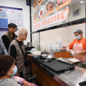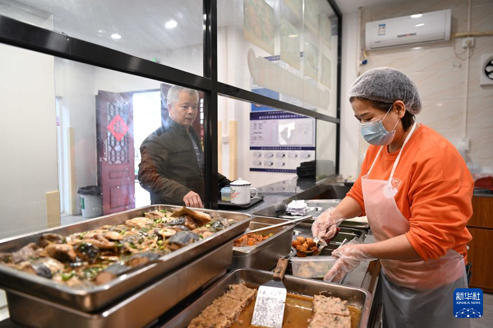 1月17日,在广州市越秀区洪桥街道三眼井社区长者饭堂,工作人员在给前来用餐的老年人打饭。