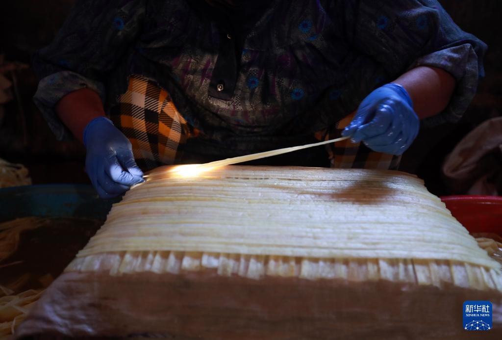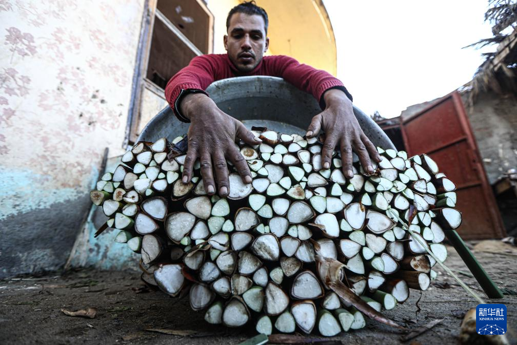 1月16日,在埃及东部省卡拉姆斯村村民赛义德的纸莎草纸制作作坊,村民将纸莎草茎秆切割成薄片。