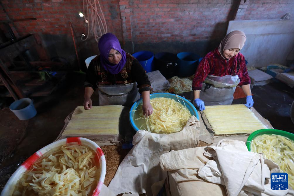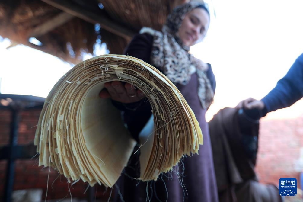 1月16日,在埃及东部省卡拉姆斯村,村民赛义德在自家的纸莎草纸制作作坊整理草纸。