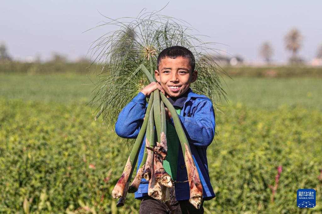 1月16日,在埃及东部省卡拉姆斯村,一名男孩扛着收割的纸莎草。