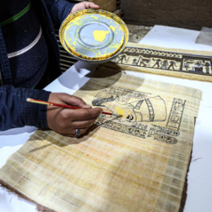利用生长在尼罗河三角洲沼泽中的纸莎草,古埃及人通过各种工序将其做成纸张使用,但这项制作技艺早已失传。上个世纪,埃及一些专家经过研究重新找到了这种古老纸张的制作方法。位于埃及尼罗河三角洲东部省的卡拉姆斯村就是这种古老纸张手工制作技艺的传承者。