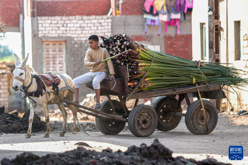 1月16日,在埃及东部省卡拉姆斯村,村民运送收割的纸莎草。
