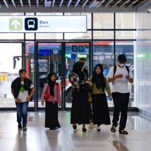 1月17日,在印度尼西亚雅加达哈利姆站,乘坐公交车抵达的乘客走进车站。