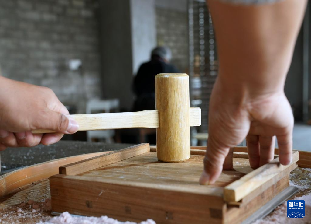杨勤峰在焋打糕模,使糕粉脱模成型(1月10日摄)。
