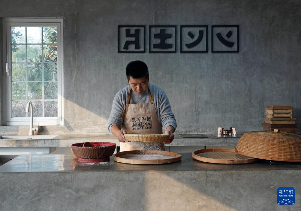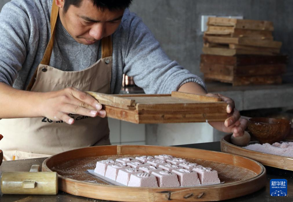杨勤峰在位于青浦区练塘镇米乐农场内的工作室内制作焋糕(1月10日摄)。