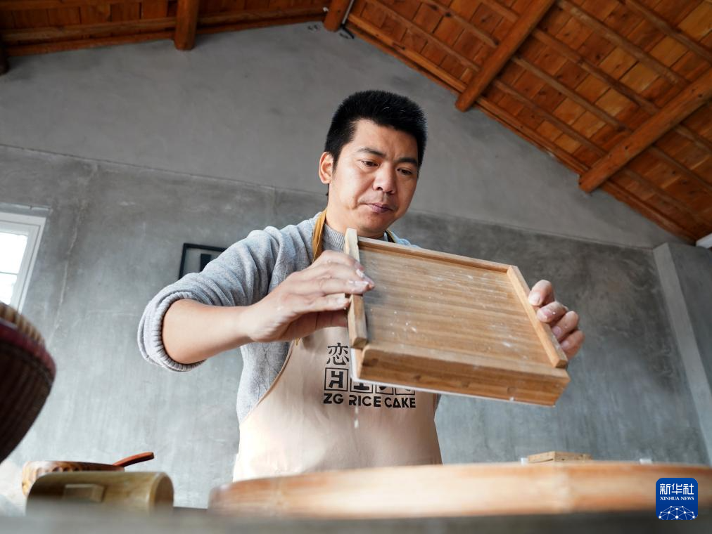 杨勤峰将糕粉过筛,使其更加蓬松(1月10日摄)。
