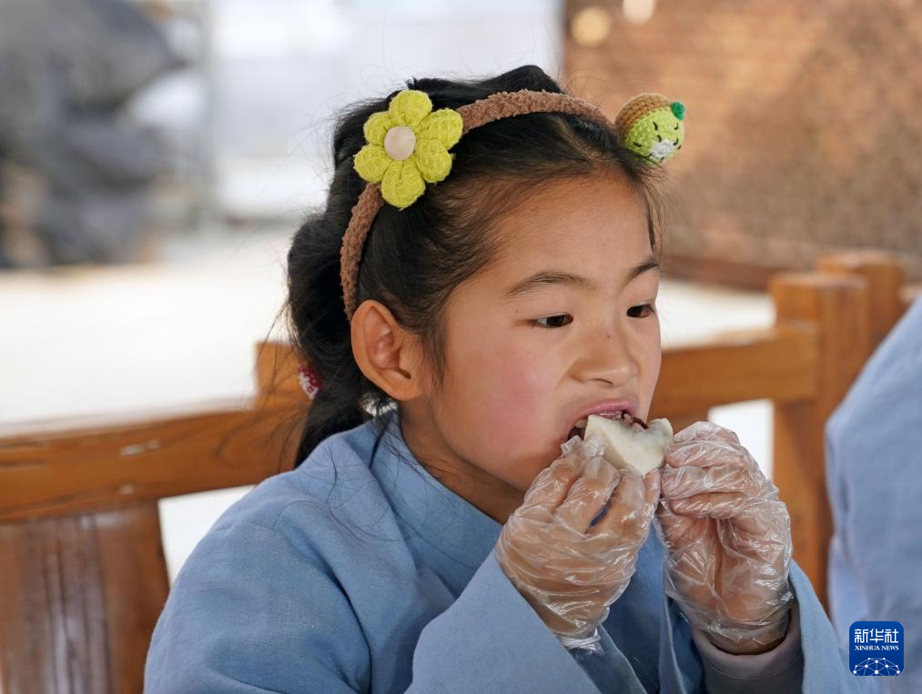 练塘镇“浦江学堂”国学公益班的孩子们品尝自己参与制作的焋糕(1月13日摄)。