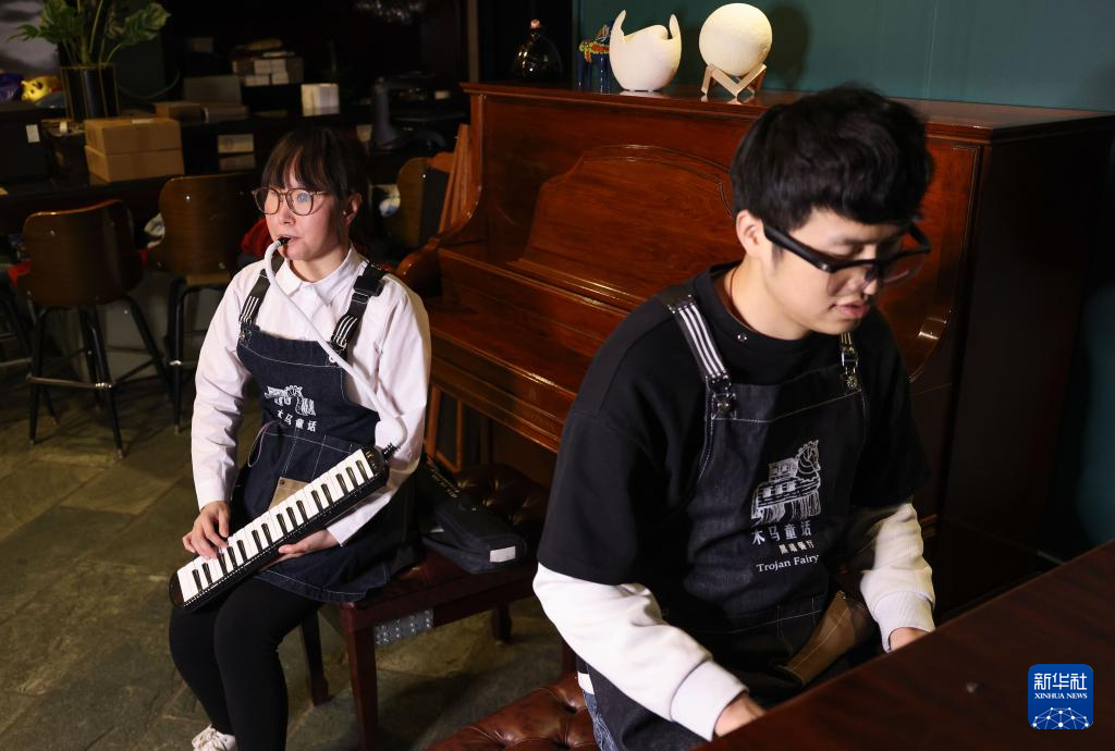 2023年12月22日,视力障碍人士支鸣(左)和杨德民在木马童话黑暗餐厅演奏。