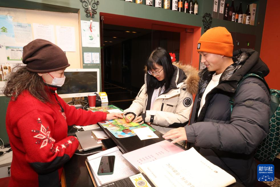 2023年12月24日,餐厅创建人于爽(左)在指导就餐者读写盲文。