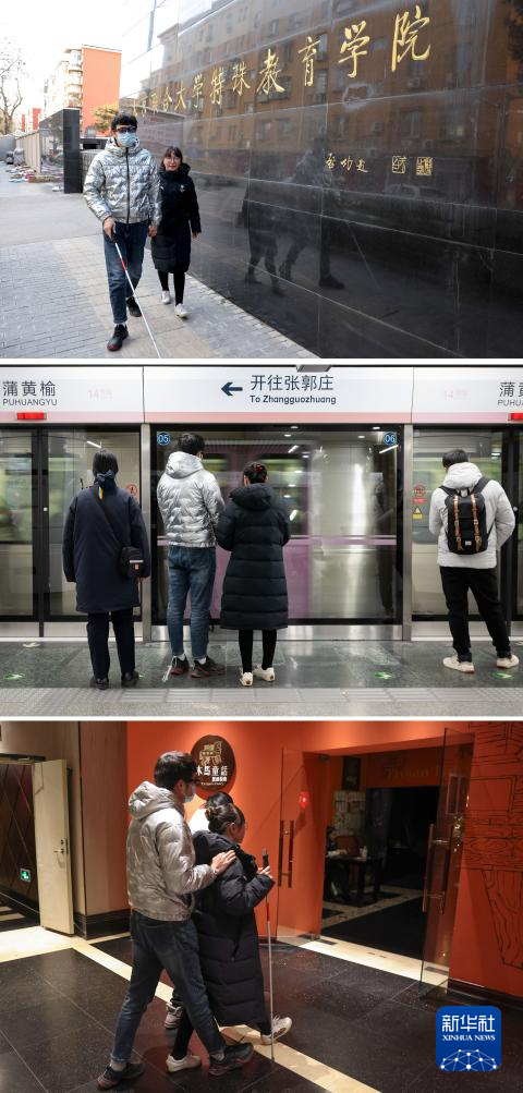 2023年12月22日,北京联合大学特殊教育学院音乐学专业的视障学生支鸣(女)和杨德民离开学校(上)、转乘地铁(中)、抵达餐厅的画面(下)。他们是情侣,两人都在木马童话黑暗餐厅兼职音乐演奏与引导员。