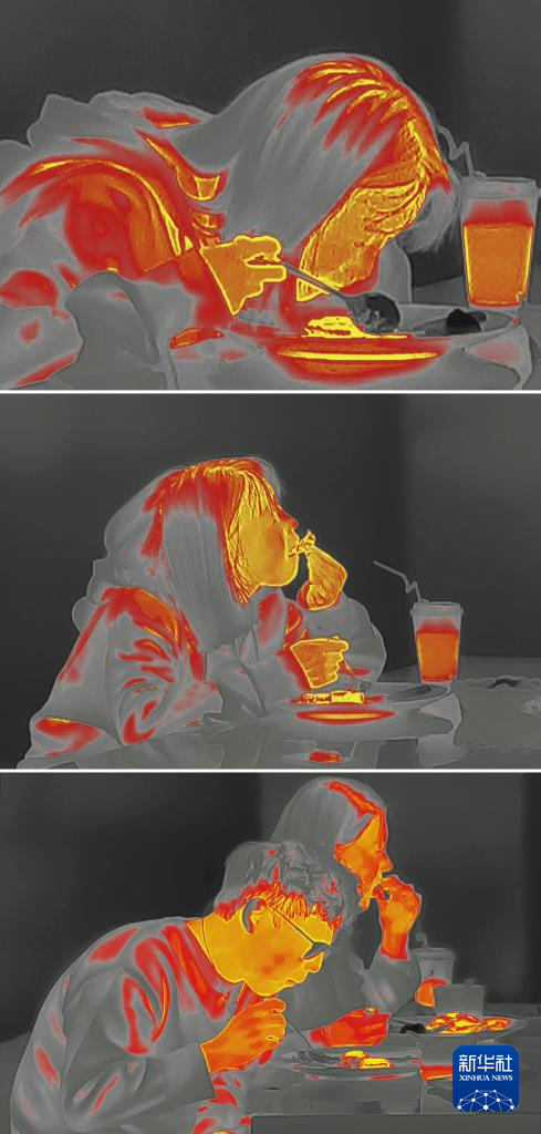 这是一张拼版照片。就餐者在全黑的环境中进餐(2023年12月24日摄,热成像摄影)。
