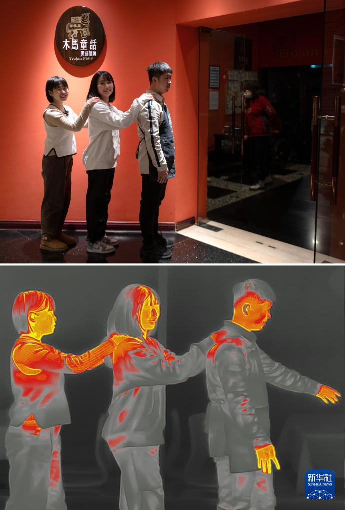 这是一张拼版照片。上图为在木马童话黑暗餐厅的门口,两名就餐者准备在餐厅服务人员的引导下进入全黑的就餐区(2023年12月24日摄);下图为就餐者在餐厅服务人员的引导下进入全黑的就餐区(热成像摄影,2023年12月24日摄)。