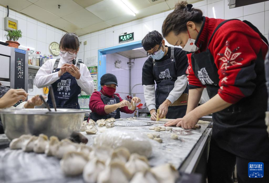 2023年12月22日是冬至,餐厅创建人于爽(右一)、视力障碍人士杨德民(右二)、肢体残疾人士贺宁(右三)、视力障碍人士支鸣(右四)等在餐厅后厨包饺子。