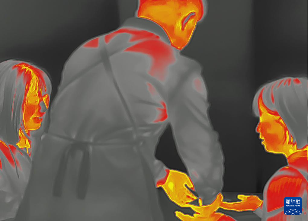 2023年12月24日,在全黑的环境中,餐厅服务员在上菜(热成像摄影)。