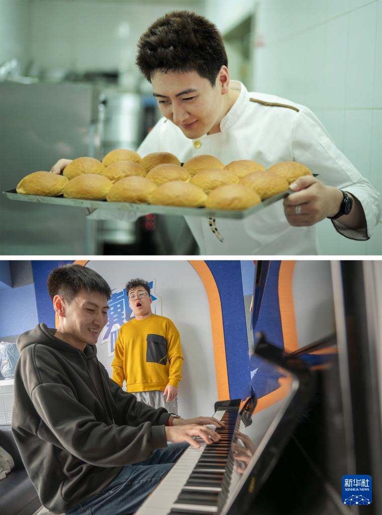 上排左至右为:博史尼撒,现在四川省攀枝花市米易县文化馆工作(受访者供图)、博史琛嫫,现为北京联合大学特殊教育学院音乐系学生(受访者供图)、周昊雨,曾在木马童话黑暗餐厅工作8年,从兼职服务员、音乐演奏,成长为餐厅经理。现在是一家艺考机构的声乐老师(新华社记者才扬摄);