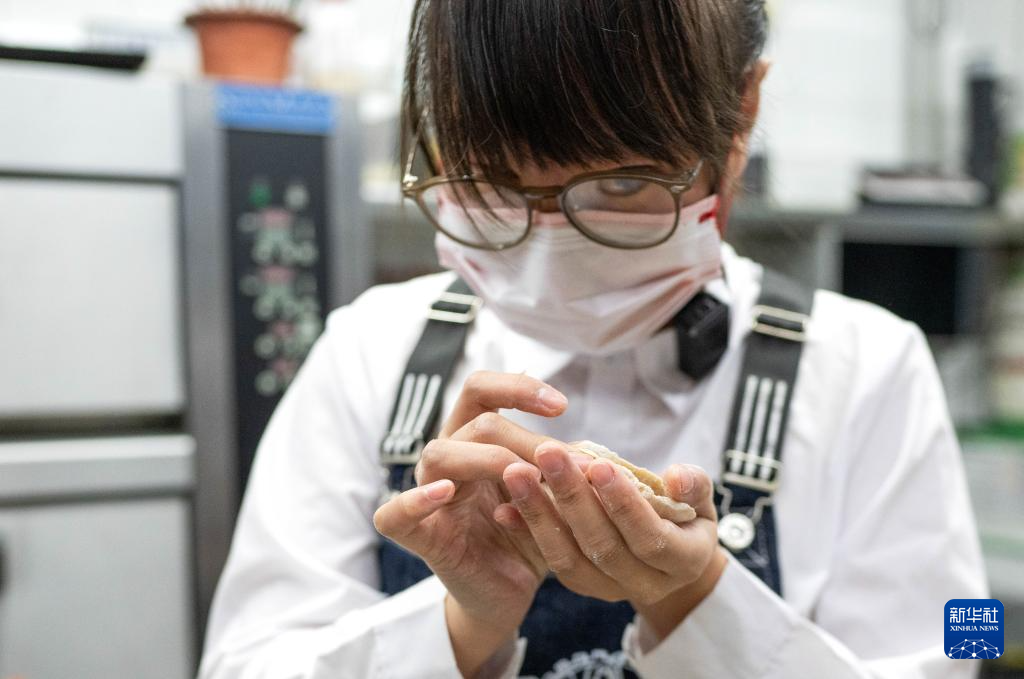 2023年12月22日,视力障碍人士支鸣在餐厅后厨包饺子。