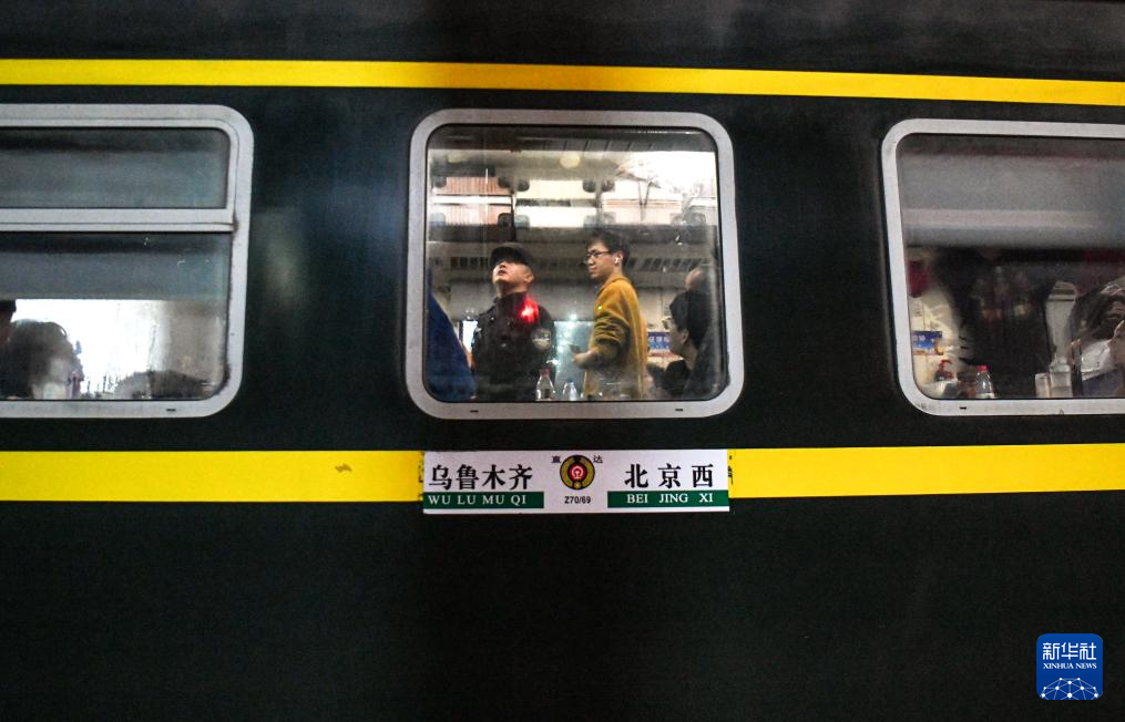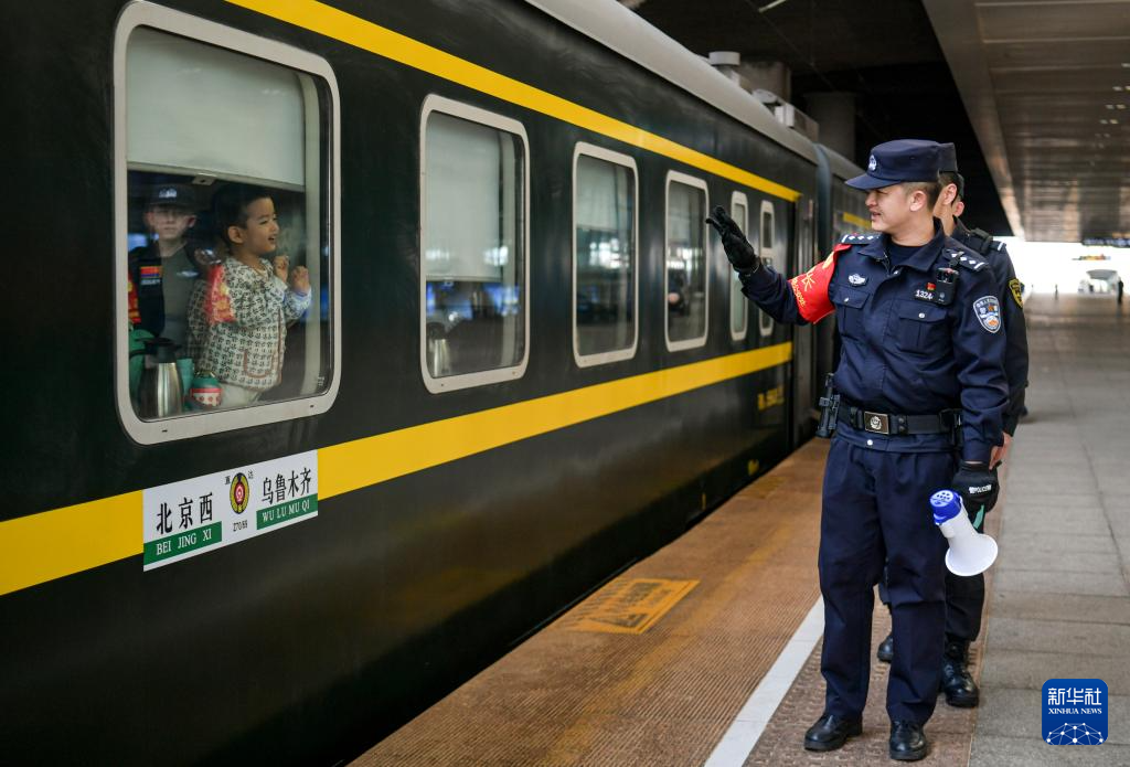 在乌鲁木齐站,张威在站台进行安全巡查时,车厢里的小乘客向他打招呼(1月11日摄)。