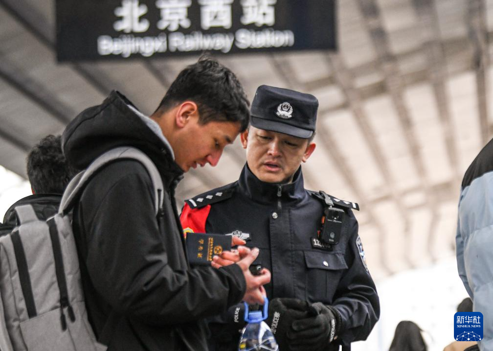 在北京西站,张威(右)在站台引导乘客乘车(1月13日摄)。