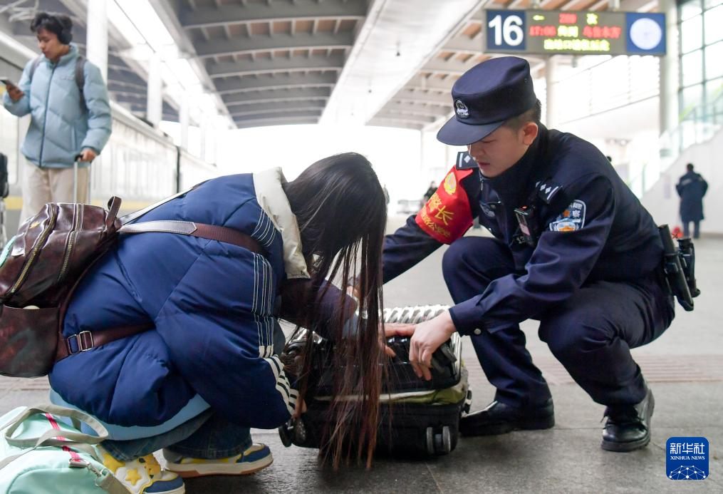 在乌鲁木齐站,张威(右)在站台上帮助乘客仔细检查行李(1月14日摄)。